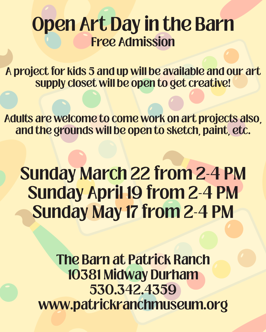 - March 22, April 19, and May 17 from 2 to 4 pm. Monthly Open Art Days in the Barn